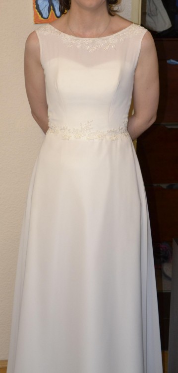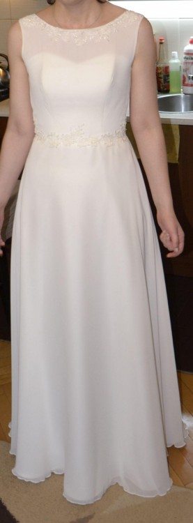 Dekolt w łódkę, suknia bez trenu, do ziemi dla pani na płaskim obuwiu o wzroście 176 cm, lub dla niższej wówczas z butami na obcasie.