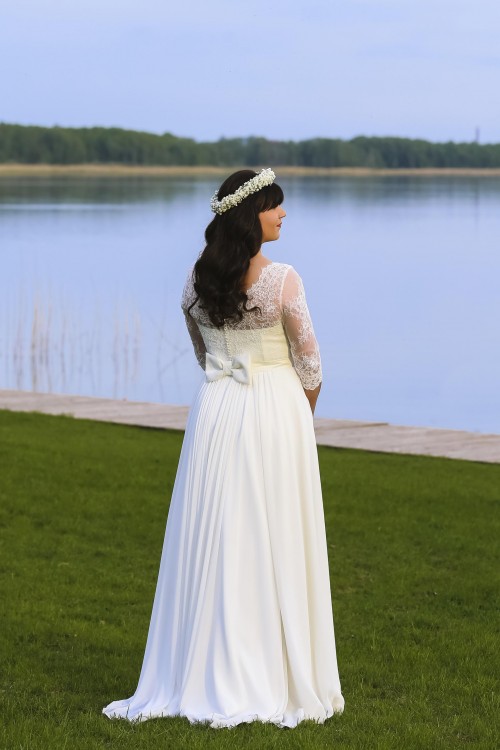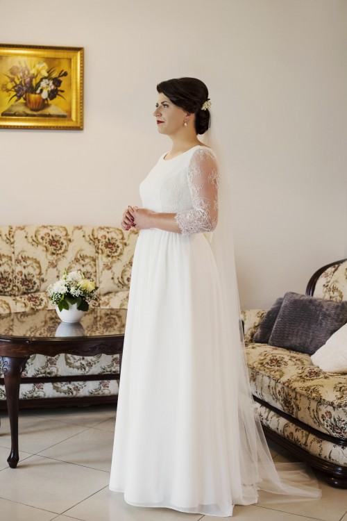 Góra sukni to dopasowany gorset, niwelujący wszystkie niedoskonałości, obszyty włoską przepiękną koronką. Dół sukni z delikatnym trenem. Suknia zaprojektowana jest tak, że tren pięknie ciągnie się, jednak w tańcu dół sukni tak się skręca, że nie potrzeba żadnych dopinek! Halka zaprojektowana specjalnie pod ten model z trzema warstwami z tyłu, z przodu pięknie odbija suknie, przez co nie plącze się pod nogami przy chodzeniu. W pasie regulowana kokarda z elementami tej samej koronki, pięknie wyszczupla talie. W komplecie jest także biała długa szarfa, którą możemy obwiązać pas na różne możliwości. Dodaję również 2 m welon muślinowy oraz krótszy obszyty delikatną koronką. Cena do negocjacji! :)