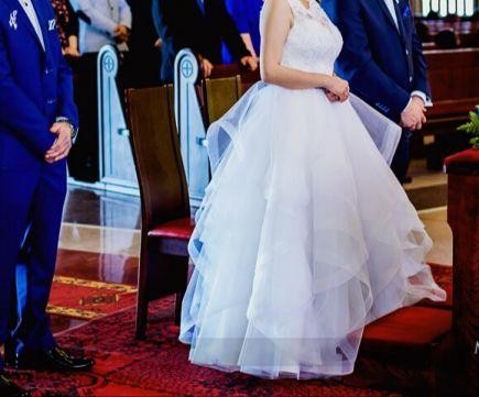 Cudowna suknia ślubna dla wyjątkowej panny młodej! Uszyta została na podstawie projektu MoriLee, szyta na miarę, rozmiar 36-38. Długość 162 cm plus 8 cm obcas (przy niższym obcasie suknia będzie sięgała bardziej ziemi). Gwarantuję, że zachwycisz wszystkich gości :) ostatnia warstwa tiulu jest do poprawki, suknia do czyszczenia. Do sukni dorzucam gratis szal atlasowy, szal polarowy, diadem, nowe pończochy samonośne oraz buciki 37. Zapraszam do przymiarki:)