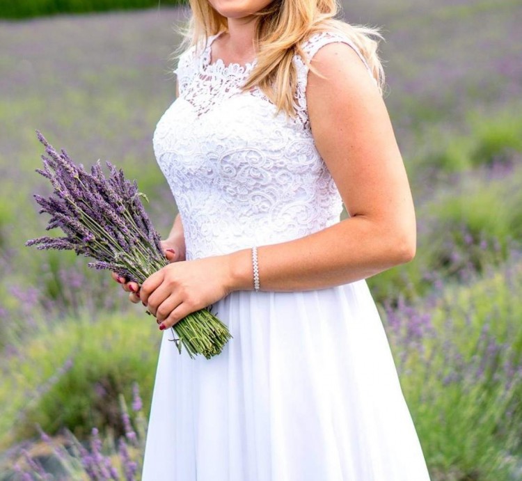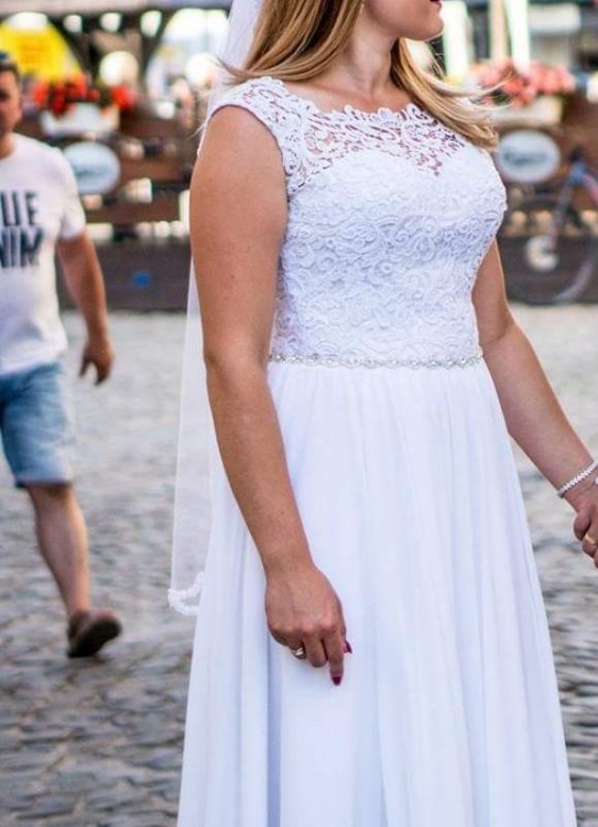 Witam, mam do sprzedania przepiękną suknię ślubną, suknia w rozmiarze od 34-40 poprzez regulowany gorset. Plecy wycięte w literkę "V" na które zachodzi koronka wykończona guziczkami. Cała góra wykończona jest bardzo elegancką koronką, dekolt w serduszko, które przykrywa koronka, dół świetnie układający się z muślinu.Talia ozdobiona jest paskiem z kryształków, który przepięknie się błyszczy i dodaje uroku sukni. Suknia wyprana chemicznie. Dodaję gratis halkę z kołem i welon wykończony koronką, zapraszam do zakupu, suknia bardzo lekka i wygodna. Więcej zdjęć prześlę prywatnie.