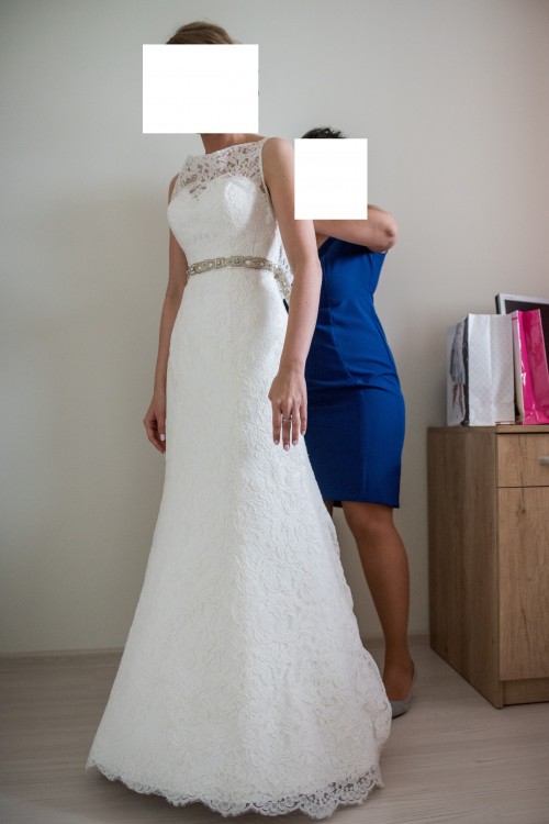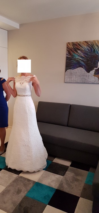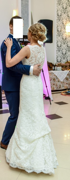 Przepiękna koronkowa suknia ślubna Anamaria z kolekcji Nabla z koronkowym, podpinanym trenem. Rozmiar 36/38 (mój wzrost 172 cm + 2 cm obcas). Obecnie jest po praniu i wygląda jak nowa. Na całej długości kręgosłupa zapinana jest na guziczki, dodatkowo oddzielnie szyta halka z kołem, która efektownie podnosi suknię. W suknię wszyty jest biustonosz. Dodatkowym elementem sukni jest pas z pięknymi kamykami. Jej ogromnym atutem jest lekkość i wygoda - czułam się w niej niesamowicie komfortowo :) Serdecznie polecam tę suknię, bo wrażenie jakie zrobiła na gościach mówiło samo za siebie ;)