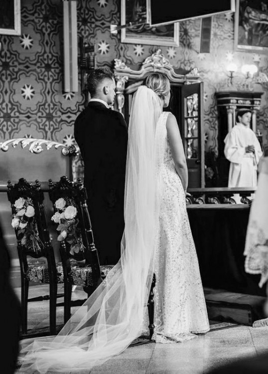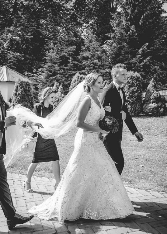 Sprzedam przepiękna suknię ślubna w rozmiarze 38 z długim welonem. Suknia w kolorze śmietanki szyta na miarę do wzrostu 166 + obcas 10,5cm. Pięknie eksponuje dekolt oraz plecy, które zdobią łańcuszki z kryształkami. Materiał z którego uszyta jest sukienka został sprowadzony na zamówienie z Hiszpanii i cudownie błyszczy, niestety zdjęcia nie są w stanie tego oddać. Całości dopełnia piękny długi welon. Suknia jest bardzo wygodna i lekka, posiada krótki podpinany na jednym guziczku tren, który jest dużą ozdoba zarówno spięty jak i luźno puszczony.