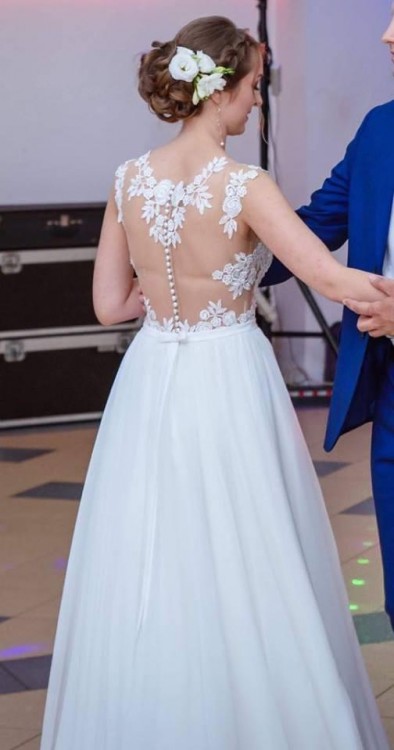 Witam, mam do sprzedania przepiękną suknie ślubną w kolorze śmietankowym. Stan idealny. Górę zdobi koronka z malutkimi perełkami naszyta na świetnej jakości cielistą siateczkę, zapinana z tyłu na guziczki, dół muślinowy-cudownie układa się podczas tańca. Nie gniecie się. Zaraz po wstaniu z krzesła suknia układa się idealnie, nie trzeba jej ciągle poprawiać. Suknia posiada regulowane koło, które można wyjąć. Od wewnątrz sukienka posiada wszyty biustonosz w rozmiarze B. Uszyta na wzrost 168cm + 5cm wysokość buta. Biejsce odcięcia talii jest zaznaczone wstażką/cienkim paseczkiem zawiązanym w kokardkę z tyłu.