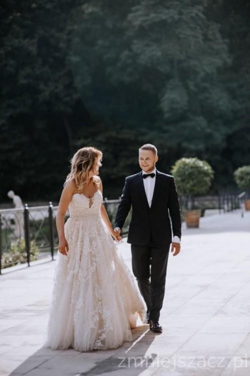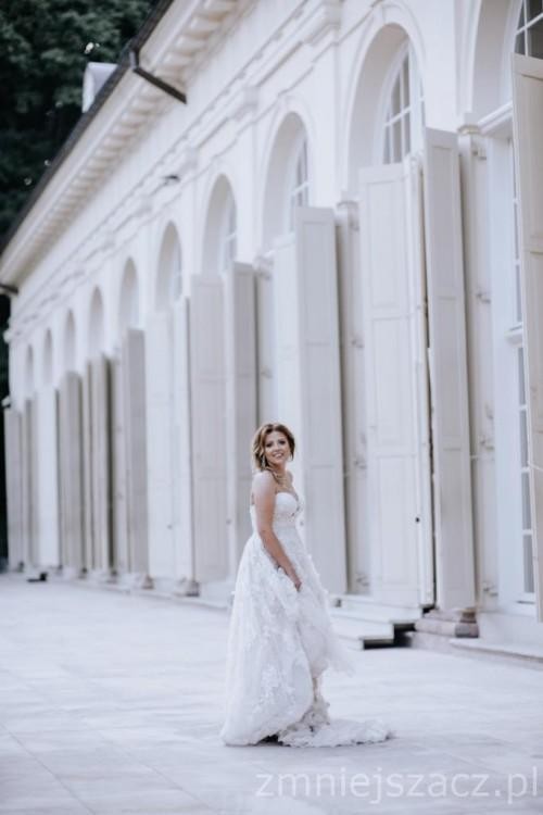 Suknia zakupiona w salonie White w Warszawie. Założona dwa razy, na ślub i sesję innego dnia. Koronka najwyższej klasy i jakości, wiele warstw materiału, bogate zdobienia i mnóstwo kamieni. Zdjęcia nie oddają tego jak na żywo, w słońcu, pięknie się mieni. Do tego bardzo wygodna, dzięki elastycznemu pasowi, znajdującemu się pod suknią, bardzo dobrze trzyma się na biuście i nie spada (nie ma też konieczności ciągłego podciagania sukni jak czesto robią panny młode:)) Achom i ochom nie ma końca, naprawdę jest to suknia idealna :)