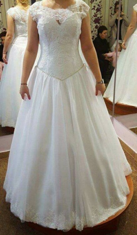Sprzedam suknię ślubną zakupioną w salonie Kasia Żnin. Rozmiar 38. Suknia z gorsetem zapinanym na zamek oraz satynowe guziczki. Gora gorsetu z koronki. Dół sukni również koronkowy. Do sukni gratis welon średniej długości. W zestawie koło. Suknię zakupilam 29 maja tego roku więc jest nowa, wyprana chemicznie, stan idealny. Zapłaciłam za nią 2750zł. Mnie interesuje 1700 do negocjacji. Możliwość przymiarki :)