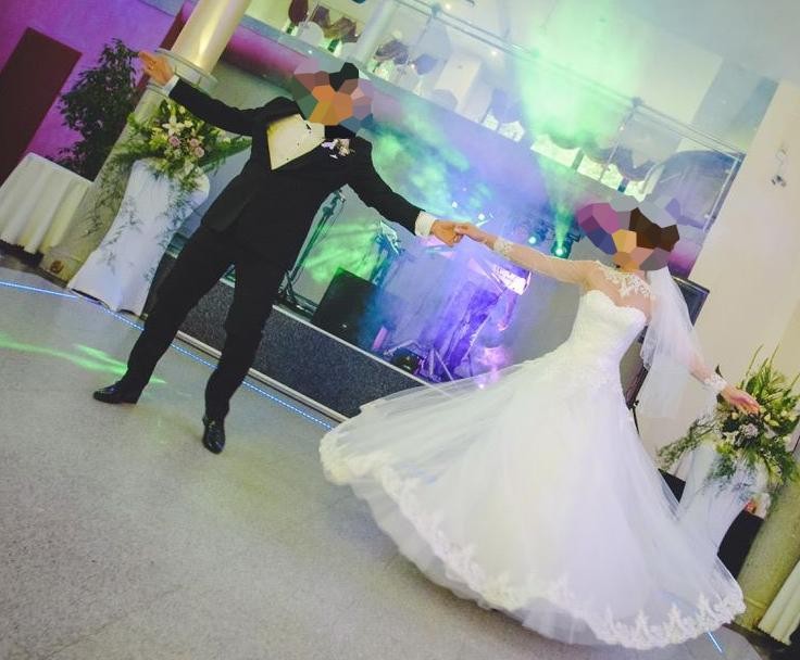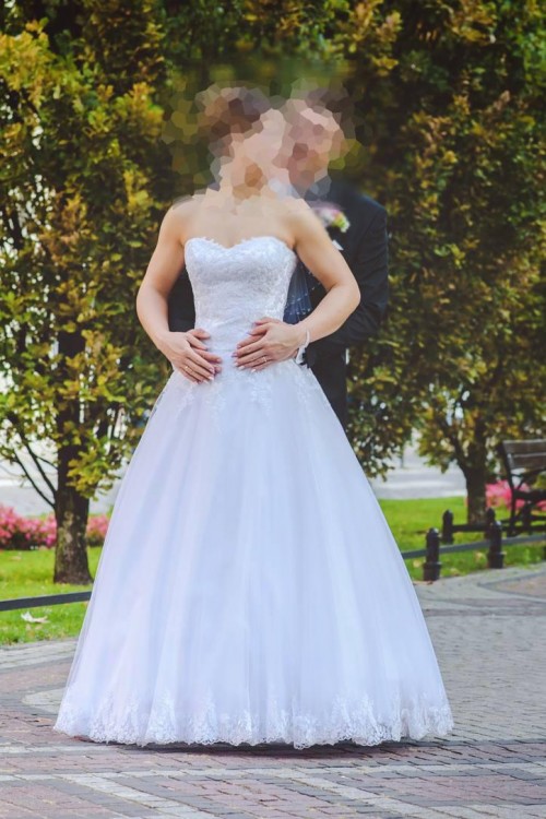 Sprzedam przepiękną suknię ślubną typu princeska. Dzięki regulowanemu gorsetowi (wiązanie) pasuje na rozmiar od 38 do 42/44. W komplecie bolerko, welon i koło. Bolerko zapinane z tyłu - zapięcie ukryte pod suknią. Wzrost 175 cm + 10 cm obcas. Zakupiona w salonie Visual Chris w Poznaniu.