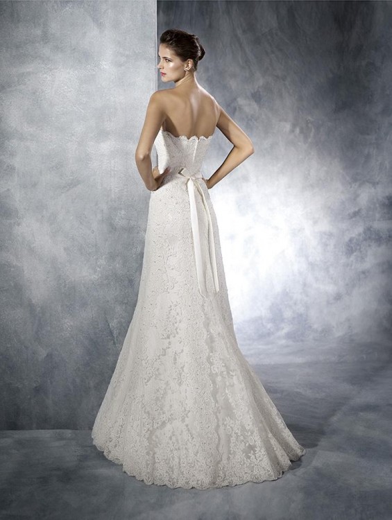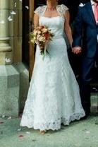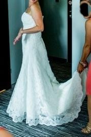 Suknia była ubrana tylko raz, jest więc w stanie idealnym. Zdjęta po północy - do szaleństw na parkiecie miałam drugą sukienkę. Zgodnie z zaleceniami producenta - nie była prana (oczywiście jest możliwość kupna sukni po praniu chemicznym). Każde pranie osłabia jednak koronkę i kolor, także suknię powinno się uprać już po własnych przymiarkach krawieckich, które bardzo suknię brudzą.