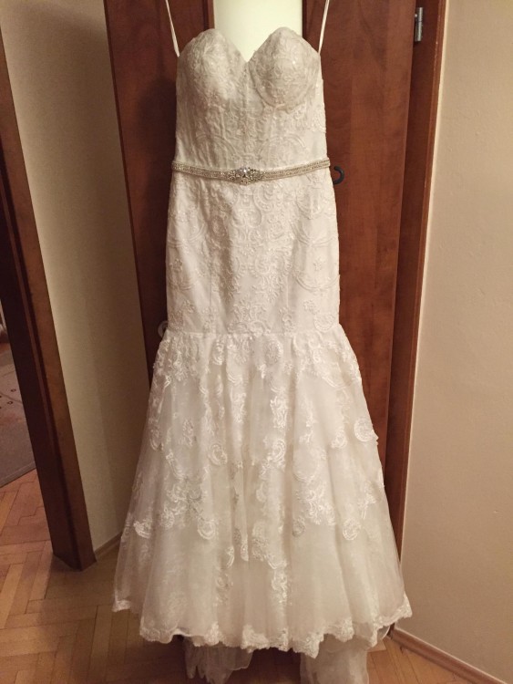 Suknia jest zdobiona pięcioma różnymi koronkami tworząc śliczny wzór. Gorsetowy stanik typu sweetheart i spódnica w stylu syrenki. Suknia z trenem (tren jest podwiązywany).