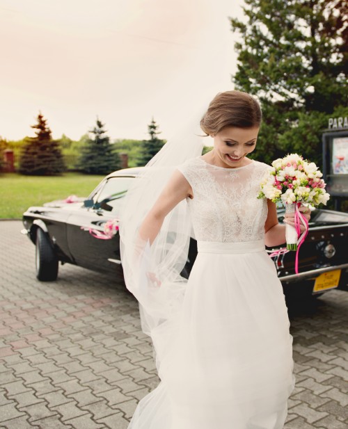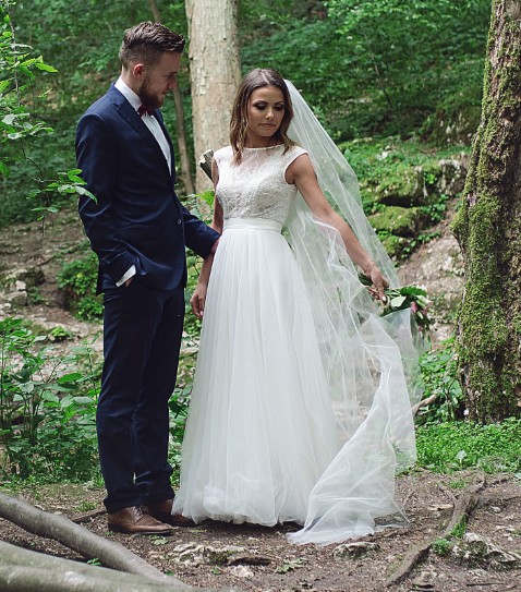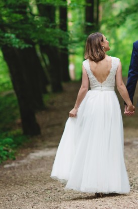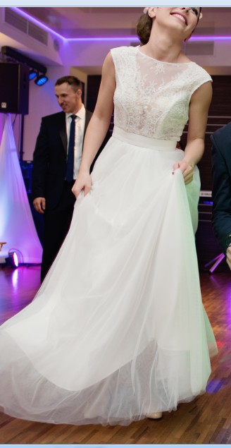 Góra sukni wykonana z delikatnej koronki na szerokich ramiączkach z zabudowanym przodem i mocno wyciętymi plecami w kształcie V. Dół z tiulu z delikatnym trenem, zwiewny dzięki czemu bardzo ładnie się układa.