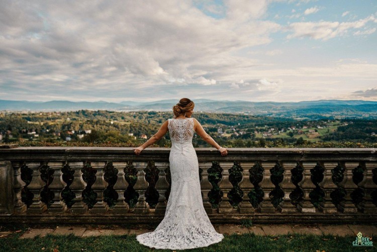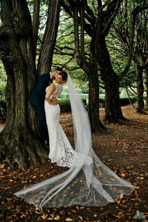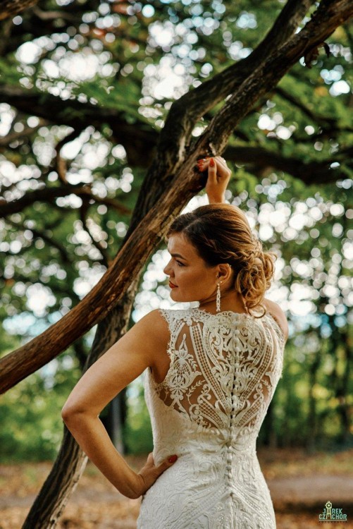 Suknia jest połączeniem dwóch modeli: FILADELFII z obłędną włoską koronką oraz FIGELI, której krój w elegancki sposób podkreśla kobiecość. Czułam się w niej wyjątkowo i pięknie, przekroczyła moje i mojego męża najśmielsze oczekiwania. Dekolt w subtelny, nieprzesadny sposób podkreśla biust, natomiast plecy zostały przykryte rozetą w formie serca utworzoną z koronki
