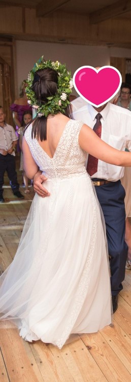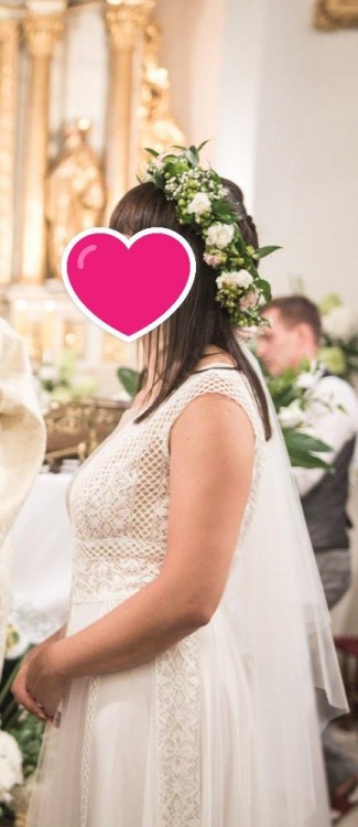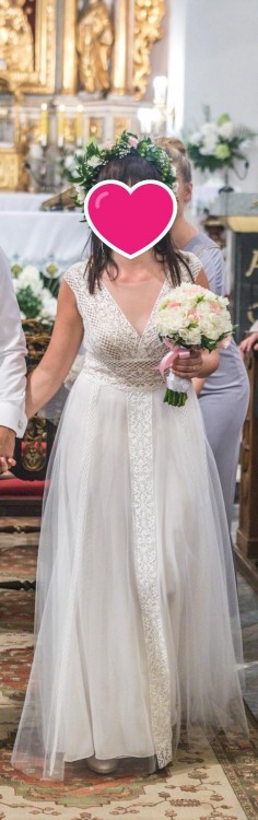 Rozmiar: 36/38 (szyta na wzrost 165 cm + 8 cm obcas). Mogę polecić również krawcową, która szyła suknię i jest w stanie wprowadzić zmiany na życzenie Panny Młodej.