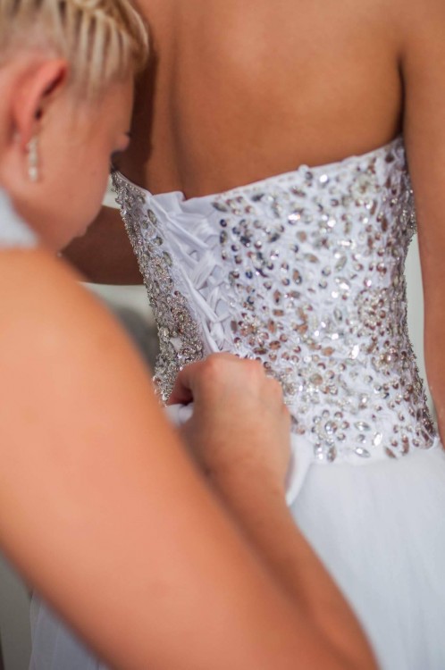 Suknia ślubna w kolorze białym, gorset zdobiony kamieniami i cekinami.