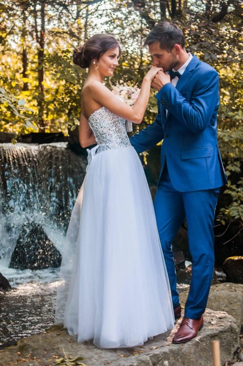 Suknia ślubna w kolorze białym, gorset zdobiony kamieniami i cekinami. Rozmiar sukni to 34/36 z możliwością regulacji dzięki wiązanemu gorsetowi. Dołączony jest welon. Suknia ma 4 warstwy tiulu i została uszyta na zamówienie. Jest bogato zdobiona, stylizowana na tzw. księżniczkę. Łączy w sobie elementy stylu rustykalnego poprzez swoją prostotę oraz glamour przez zdobiony gorset. Idealnie podkreśla sylwetkę. Dodatkowo przy sukni znajduje się kokarda zapinana na agrafki, ukrywająca wiązanie gorsetu. W przypadku wątpliwości służę pomocą i chętnie odpowiem na każde pytanie. W razie potrzeby mogę dosłać więcej zdjęć samej sukni. Zachęcam do kupna, suknia jest na prawdę zachwycająca. Suknia jest wyczyszczona, w stanie idealnym i nie posiada żadnych uszkodzeń ani śladów użytkowania.