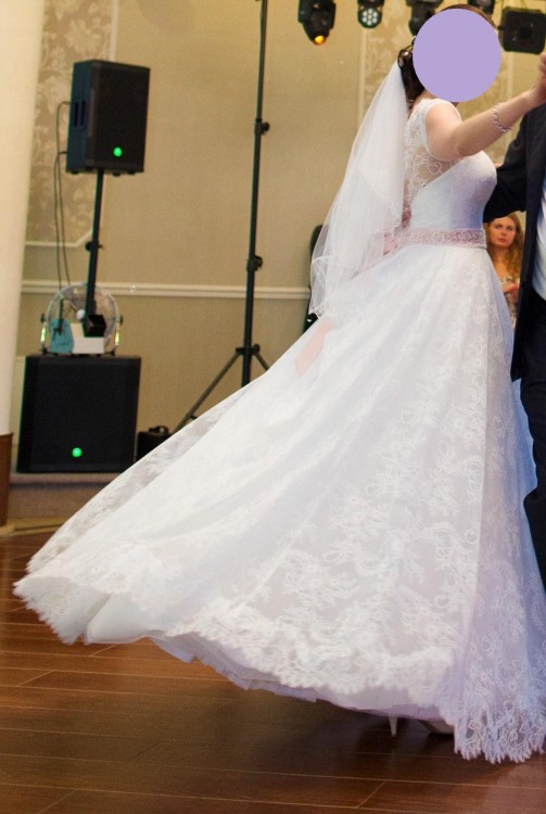 Oferuję prześliczną i mega wygodną suknię ślubną wykonaną w całości z włoskiej, miękkiej koronki w kolorze bieli, ze zdobionym paskiem w kolorze bladego różu (wszyty). Suknia w przepiękny sposób eksponuje plecy oraz ma podpinany tren. Do tego wspaniale prezentuje się zarówno w spoczynku (kościół), jak i w ruchu (taniec).