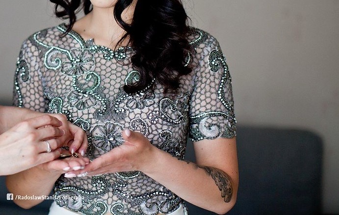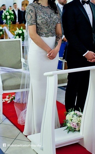 Suknia niespotykana. Dwuczęściowa. Ręcznie zdobiony gorset, wyszywany błyszczącymi się brylancikami oraz kamieniami. Dół sukni pięknie podkreśla kobiece kształty. Wstawka z motywem z gorsetu cudownie łączy suknie w jedną całość. Wszyte guziczki podkreślają tyłek oraz nadają kształt całej sukni.
