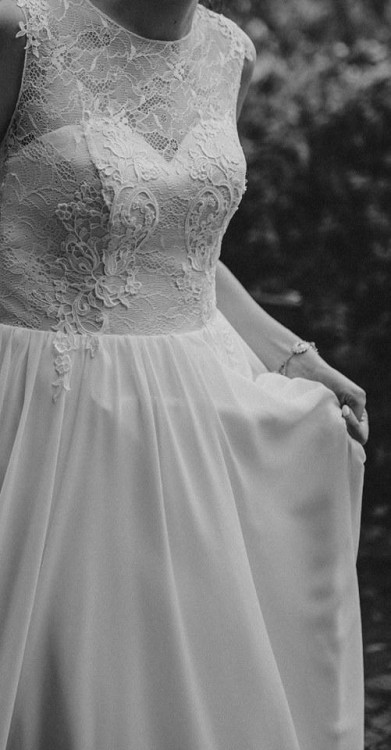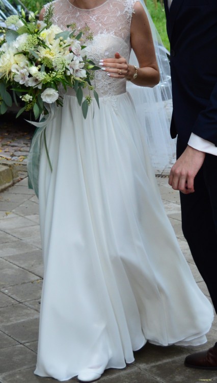 Prosty fason w kształcie literki A. Idealna na wesele w stylu romantycznym, boho, rustykalnym... Suknia w kolorze ECRU, z delikatną koronką (niegryząca!) zakrywającą dekolt i plecy, z lekkim gorsetem w kolorze NUDE, na dole kilkuwarstwowy lejący się, miękki materiał (robi cudowne wrażenie lekkości!). Bez trenu i koła.