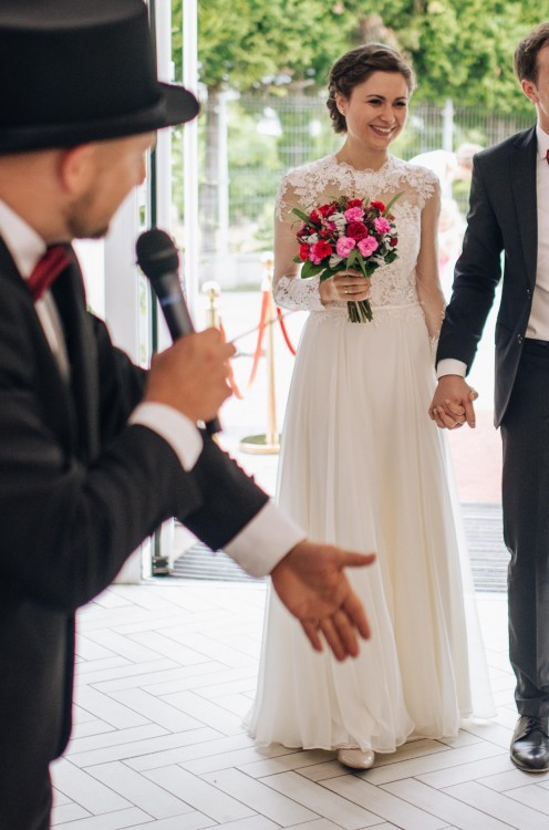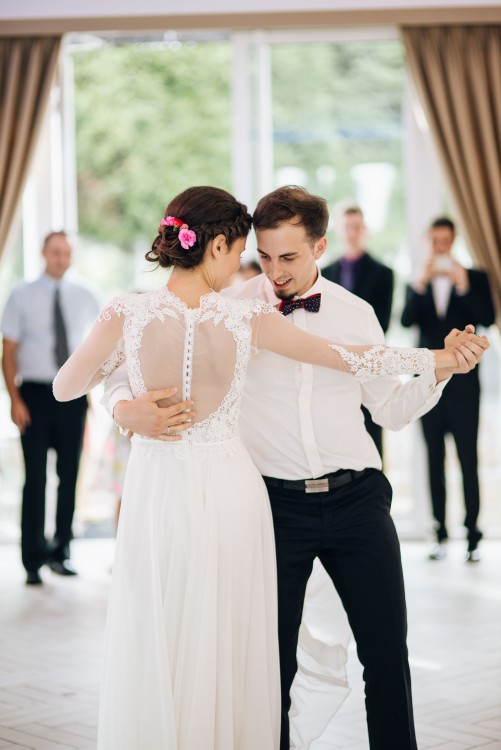 Sukienka z przepięknymi długimi rękawami, góra zdobiona koronką, dół z 3 warstw materiału, który pięknie układa się w tańcu.