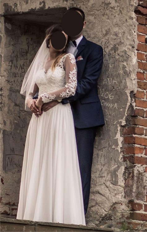 Mam do sprzedania przepiękną suknię ślubną, skromna, wygodna i lekka, wykonana z muślinu, który króluje obecnie w trendach ślubnych.