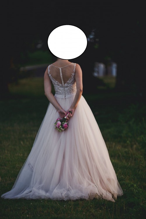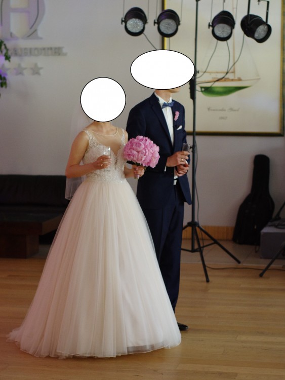 Suknia jest wyczyszczona w pralni chemicznej, wyprasowana i nie ma na niej śladów użytkowania.