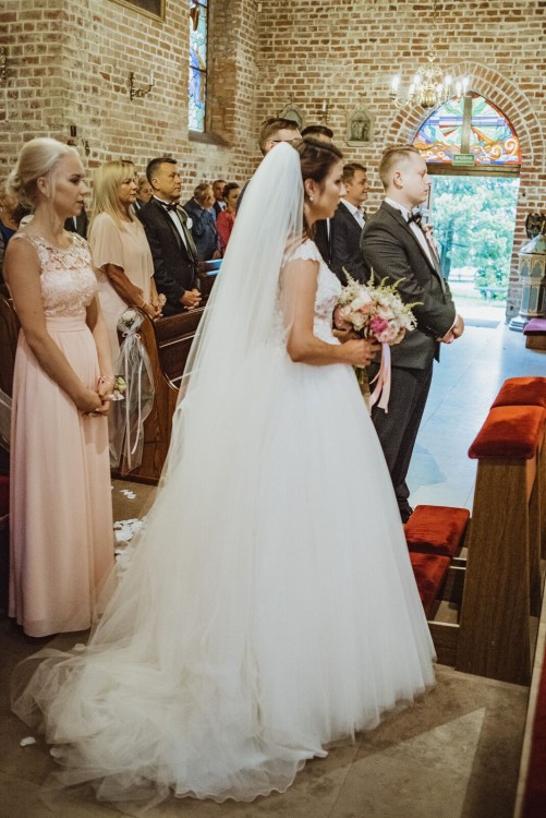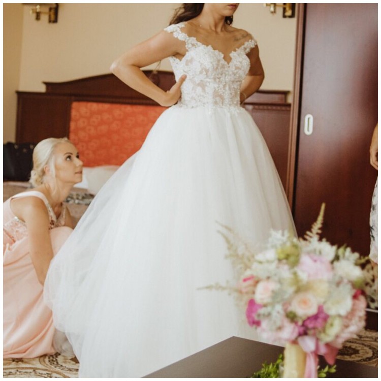 uknia ślubna ze znanego i cenionego salonu Madonna w Gdyni. Suknie charakteryzuje niesamowicie miękki tiul, który lekko się układa i nie krępuje ruchów. Warstw tiulu jest dużo, dlatego suknia nie potrzebuje koła. Piękna koronka na gorze sukni ozdobiona małymi perełkami dodaje jej lekkości i niepowtarzalności. Suknia nie została zniszczona, została ubrana tylko raz, jak łatwo się domyślić-na moim ślubie :) i prezentuje się tak samo pięknie jak w dniu ślubu.