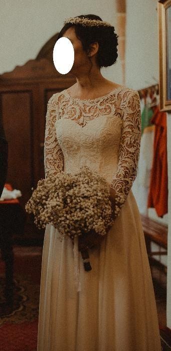 Mam do sprzedania piękną suknie ślubną z salonu Margarett z kolekcji Amore 2017, model Amata. Suknia szyta na miarę na wzrost 170 cm + obcas 9 cm, rozmiar 34/36. Amata to romantyczna suknia ze zwiewnym muślinowym dołem i gorsetem w serduszko z nowoczesną gipurową koronką o długości rękawa ¾. Suknia ma podwyższony gorset w stosunku do oryginalnego wzoru salonowego, żeby można było normalnie założyć stanik, co zapewnia dodatkowy komfort, wszystko trzyma się na swoim miejscu, a nie widać zapięcia biustonosza Gorąco polecam, suknia robi wrażenie, koronka jest miękka, przyjemna i „nie gryzie”, a dłuższy rękawek dodaje uroku nie krępując ruchów w tańcu. Zachęcam do zakupu, oczywiście można przyjść przymierzyć we Wrocławiu. Pozdrawiam
