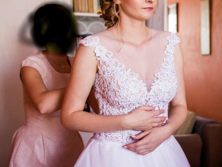 Suknia wykonana jest na górze z jasnej, prześwitującej koszulki i naszytej koronki z kryształkami, a także posiada cieliste miseczki, dzięki czemu podkreśla romantyczny charakter sukni. Tył sukni jest odkryty, jedynym zakryciem pleców są kryształowe guziczki.