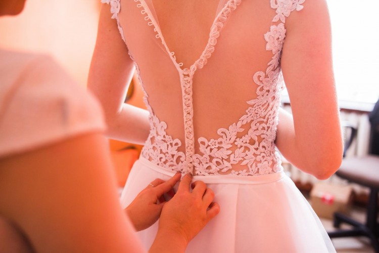 Suknia została poddana czyszczeniu, co przyczyniło się do oderwania jednego z guziczków, bez problemu dostępnego u krawcowej.
