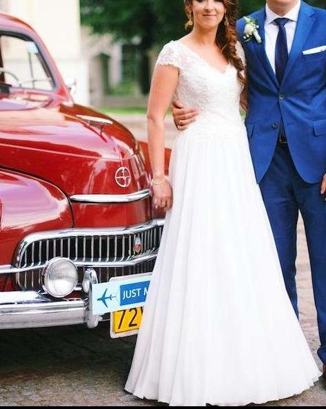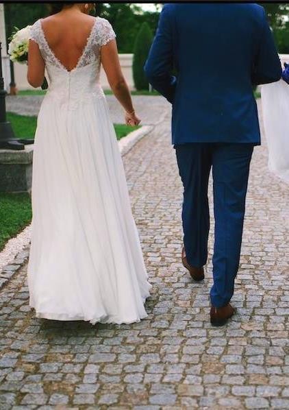 Sprzedam suknię ślubną, rozmiar 36/38 , na wzrost 166 cm plus 7 cm obcas, kupioną w jednym z warszawskich salonów. Suknia ma piękne, koronkowe zdobienia na gorsecie oraz subtelne wycięcie na plecach. Suknia ładnie prezentuje się zarówno podczas noszenia, jak i na zdjęciach. Wykonana jest z miękkiego, leistego materiału, który bardzo dobrze się układa i nie plącze. Poza tym posiada wszyte koło, dzięki czemu nie trzeba wypożyczać dodatkowej halki. Suknia jest elegancka, a jednocześnie delikatna i romantyczna, nie przeszkadza w tańcu. Na życzenie mogę również dołączyć welon.