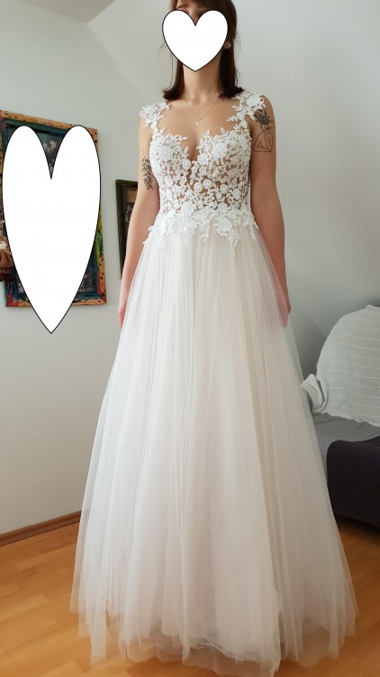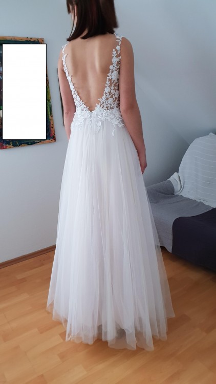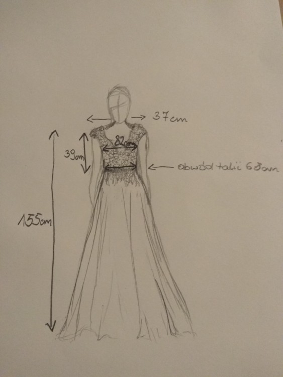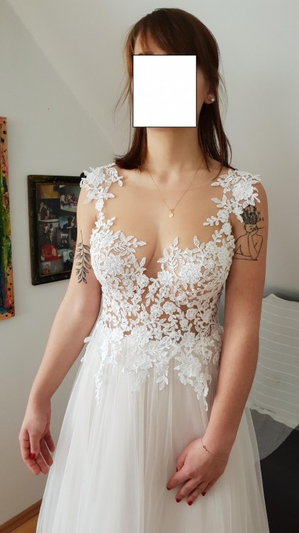Wymiary:szerokość ramion: 37 cm,Obwód biustu: 82 cm, Obwód tali 68 cm, Długość od ramion do talii: 39 cm, długość całkowita: 155 cm. Tył pleców wycięte w literkę V. Długość sukni można bardzo łatwo dopasować {dociąć}. Dołączam 3 metrowy welon w kolorze ivory. Możliwość obejrzenia i przymiarki sukni w Lublinie. Suknia jest w stanie idealnym ponieważ była założona tylko do kościoła i na mały obiad dla rodziny (bez wesela). Cena do lekkiej negocjacji.