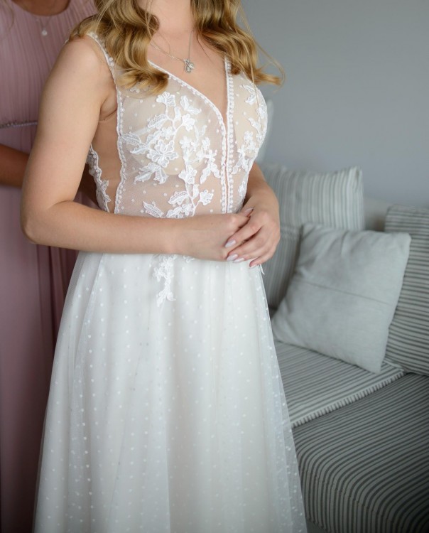 Witajcie przyszłe panny młode. Z pewnością każda z was marzy o tym, by ten jedyny dzień, który już planujecie był wyjątkowy. Z pewnością taki będzie jeśli wy będziecie się tak czuły. Każda z nas marzy o tym by w tym dniu wyglądać obłędnie! Ja swojej sukni szukałam długo i zakochałam się od pierwszego wejrzenia! Teraz nadszedł czas, by inna panna młoda mogła się nią zachwycić. Suknia jest w modnym, romantycznym stylu połączonym z boho. Malutkie groszki na tiulu dodają jej magicznego uroku, a zdobienia koronkowe są bardzo delikatne. Suknia jest bardzo wygodna i lekka. Posiada wycięcie na plecach w postaci litery V. Nie jest to czysta biel, materiał pod tiulem jest bardziej ecru. Na biuście są doszyte specjalne podszewki w kolorze cielistym zapewniając komfort. Suknia idealnie podkreśla figurę. Nie ma żadnych wad.