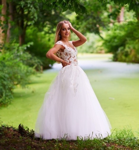Piękna suknia princessa lanesta, góra pokryta cielistą siateczką i delikatną koronką. Subtelny kolor ecri doskonale podkreśla karnację. Tiulowa spódnica, determinuje całą stylizację nadając jej romantycznego i bajkowego uroku. Koronkowa góra w którą wszyte są miseczki zapewnia komfort i doskonale podtrzymuje biust. Cielista siateczka która pokryta jest koronką doskonale prezentuje się zarówno z przodu jak i z tyłu.