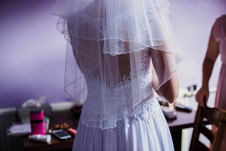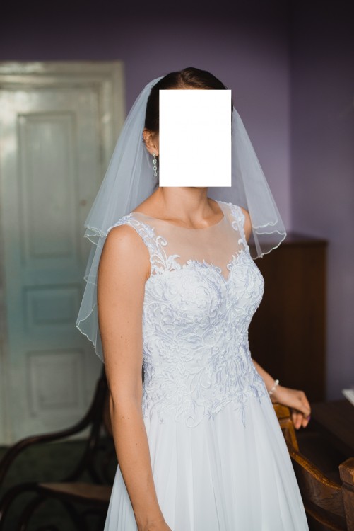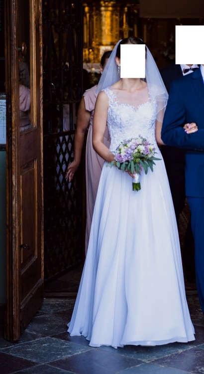 Sprzedam śnieżnobiałą suknię ślubną w rozmiarze 36/38 na wzrost 170cm + 7cm obcas (skracanie sukni jest bezproblemowe). Wymiary talia 68cm, biust ok. 88cm (jest wszyty biustonosz z wkładkami więc można regulować). Suknia jest w stanie idealnym, nie ma żadnych śladów użytkowania i została wyprana w profesjonalnej pralni. Jestem jej pierwszą właścicielką (użyta we wrześniu 2016r.), suknia była szyta na miarę w salonie sukien ślubnych. Suknia jest kształtu litery A, pasuje na większość kobiecych figur. Gorset sukni zdobi gipiura na delikatnej tiulowej siateczce. Góra sukni delikatnie się mieni. Warstwa zewnętrzna dołu sukni wykonana jest z muślinu, dzięki czemu wygląda zjawiskowo i lekko. Dół sukni jest zrobiony zakładkowo w pasie i przykryty subtelnie gipiurą, co sprawia że wyjątkowo wyszczupla. Suknia jest na halce tiulowej, bez żadnego koła, przez co pięknie się układa i wygodnie się w niej porusza. Suknię zapina się na krótki suwak na dole pleców, a powyżej gdzie plecy są odkryte (przekryte jedynie tiulem) zapina się na guziki. Do sukni dołączam krótki welon tiulowy na grzebyku, zakończony delikatnymi koralikami. Piękno welonu tkwi w jego prostocie oraz idealnym dopasowaniu do tej sukni. Suknię miałam na sobie w dniu ślubu i na sesji plenerowej, w której pozowałam do zdjęć w lesie (bez żadnych ekscesów typu wchodzenie w sukni do wody i siadania na nie wiadomo czym), po czym oddałam ją do profesjonalnej pralni w Warszawie. Ręczę za jakość i brak uszkodzeń/plam sukni. A jeśli chodzi o urok sukni, to myślę że najwięcej mówią komplementy jakie dostałam od męskiego grona weselnego, którzy byli zachwyceni suknią - a to jednak dużo mówi. Suknia bardzo wygodna, nie krępuje ruchów, jest zwiewna, w tańcu układa się cudownie. Gorąco polecam szczególnie dla kobiet romantycznych :)