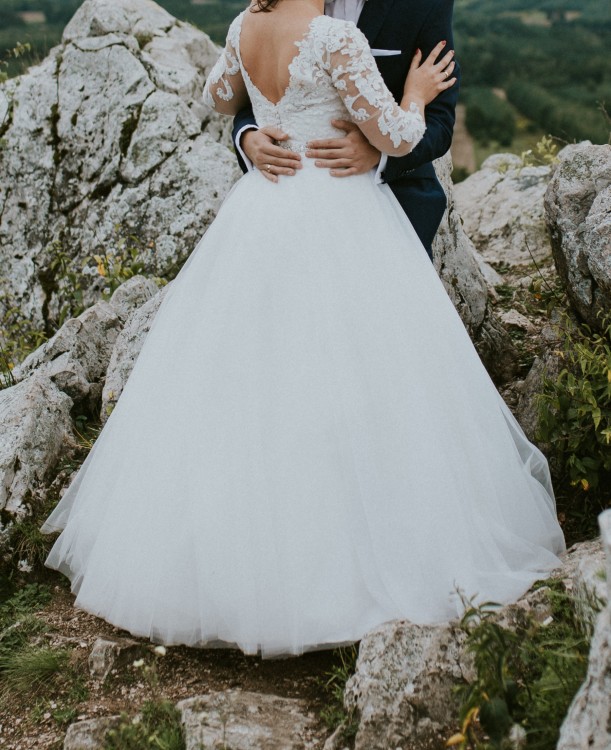 Sprzedam piękną, romantyczną suknię ślubną z rękawem 3/4 zdobionym jedwabną koronką/gipiurą podkreślającą lekkość i delikatność sukni.