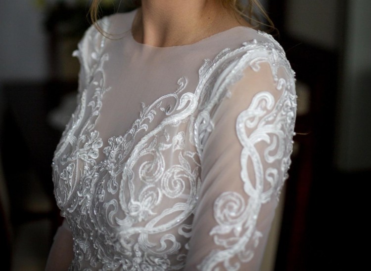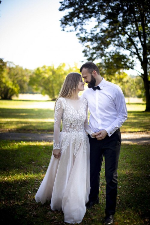 Suknia jest zwiewna, niezwykle lekka i bardzo wygodna. Przepięknie układa się w tańcu. Góra koronkowa z kryształkami Swarovskiego, dół jedwabny. Z tyłu zamek oraz wycięcie w literę V.