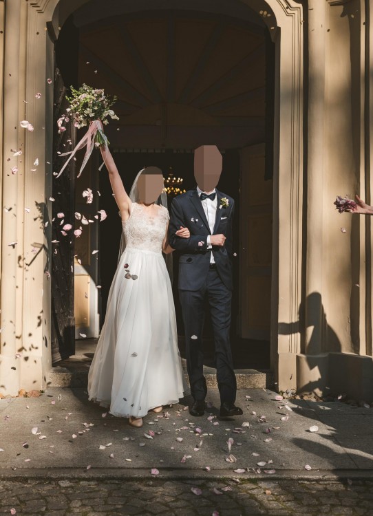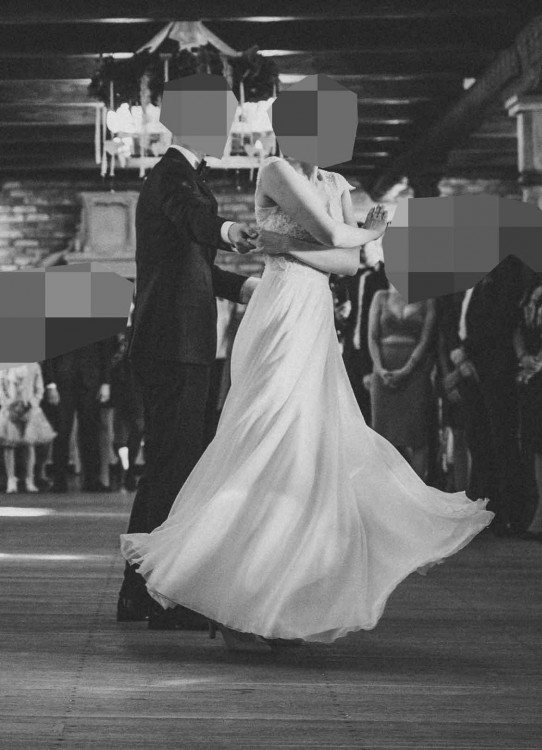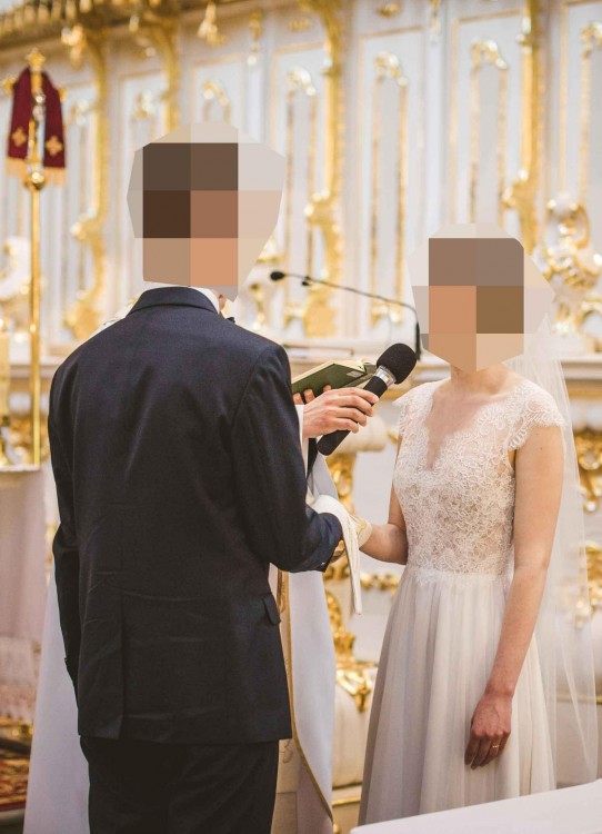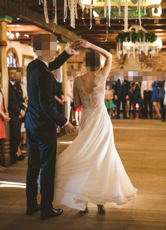 Jeśli miałabym ją pokrótce opisać to zdecydowanie jest ona bardzo lekka, wygodna i zwiewna. Pięknie układa się w tańcu, jednocześnie nie krępując ruchów i nie plącząc się na parkiecie. Jej fason nie wymaga dodatkowego okrycia w kościele.
