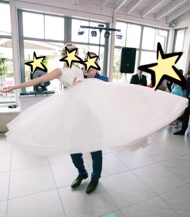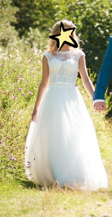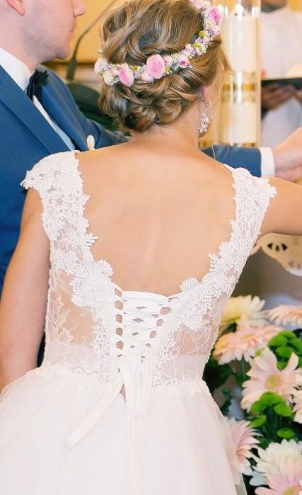 Cudowna suknia w kolorze śmietankowej bieli. Góra wykonana z aplikacji koronkowych, niezwykle trwałych, dół tiulowy, rozkloszowany, suknia nie wymaga koła, przepięknie układa się w tańcu. Długość około 160- 162cm plus 7cm obcas. Rozmar od 32 do 36 ze względu na regulację z tyłu. Stan idealny, po profesjonalnym czyszczeniu. Serdecznie polecam!!! Cena 2000 zł do negocjacji. Zapraszam do kontaktu SMS.