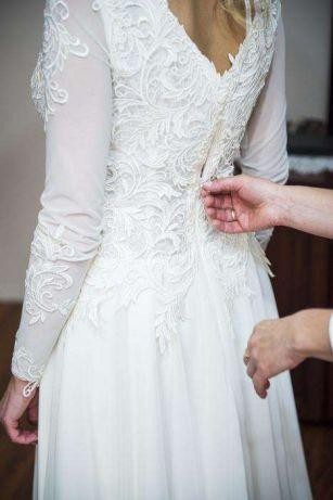Fason w linii A. Górna część sukni zdobiona śliczną, delikatną koronkową gipiurą nadającą sukni romantycznego stylu, dolna część z pięknie układającego się muślinu.