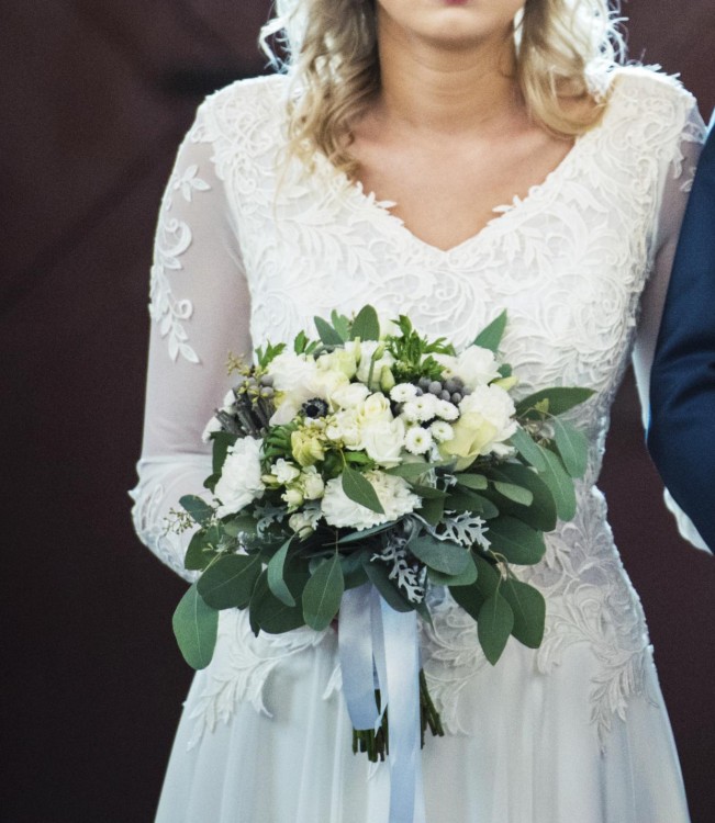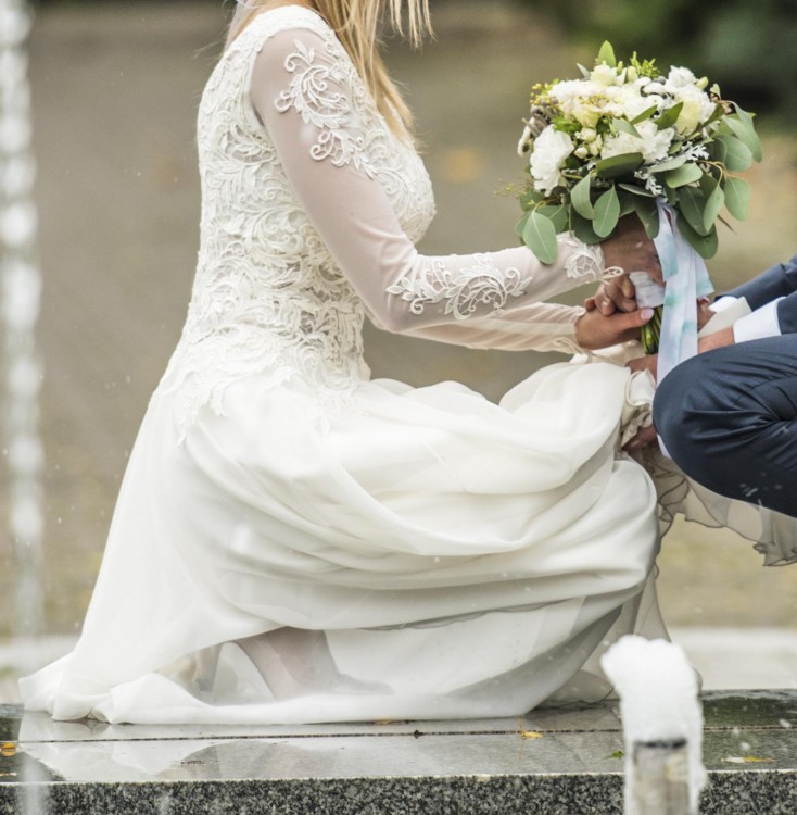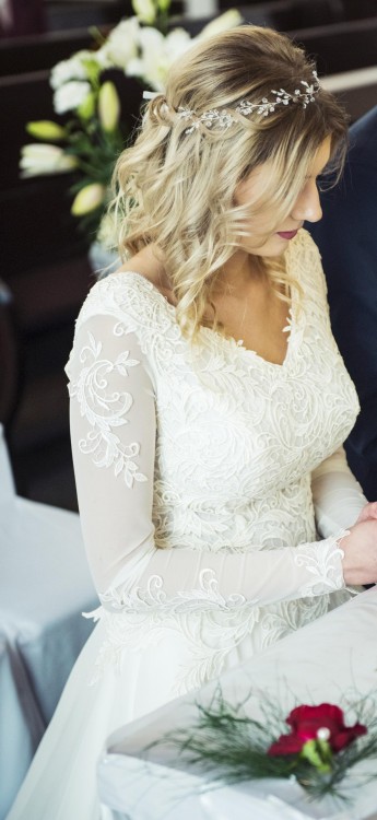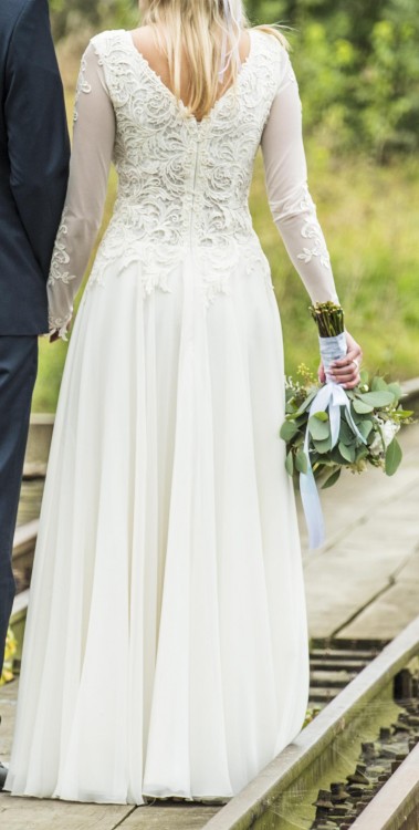 Fason w linii A. Górna część sukni zdobiona śliczną, delikatną koronkową gipiurą nadającą sukni romantycznego stylu, dolna część z pięknie układającego się muślinu.
