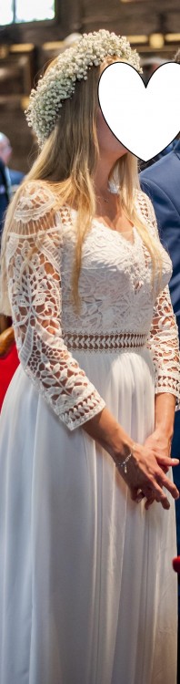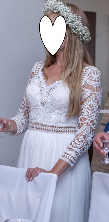 Sukienka była założona raz (tylko w dniu ślubu i bez sesji zdjęciowej w dodatkowym terminie). Sukienka była założona do białych balerinek i sięgała do samego dołu. Nie ma problemu z jej skróceniem, nie posiada koła, odstających halek typu księżniczka.