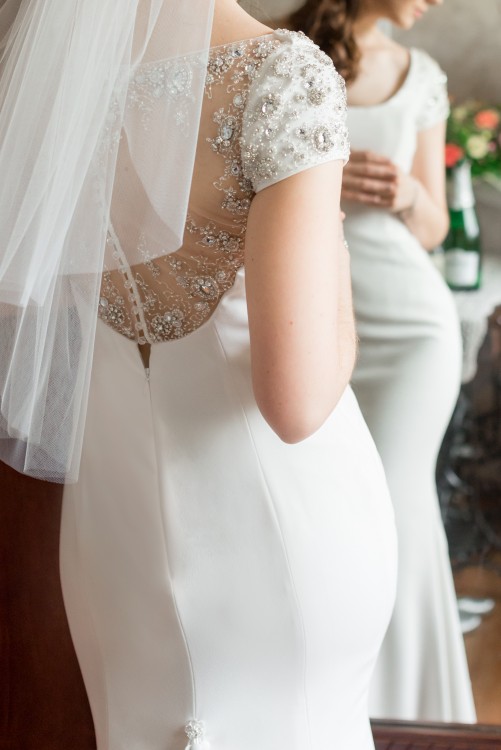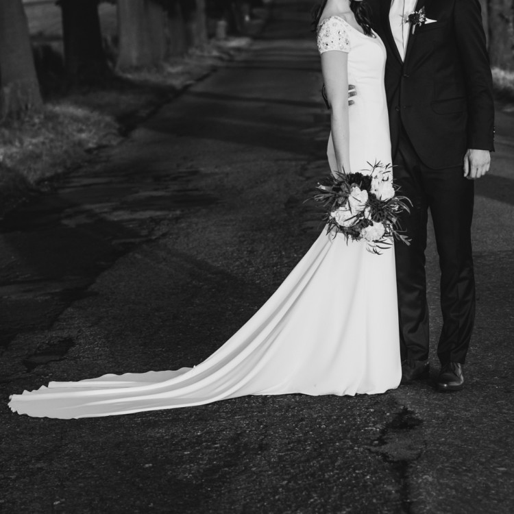 Ma długi, prosty tren, który można podpiąć i przepiękne zdobienia na plecach.