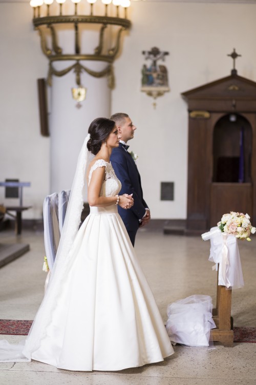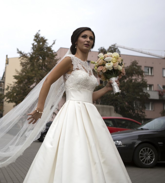 Piękna, elegancka i klasyczna suknia w kolorze off white (przełamana biel), z delikatną koronką. Dla kobiet, które lubią podkreślać swoje kształty. Charakteryzuje się wąska górą i szerokim dołem ( materiał- mikado ). Model odpowiedni dla każdego typu sylwetki, dzięki odcięciu w pasie doskonale podkreśla wcięcie w talii. Istotne jest to, że suknia nie była za mocno przerabiana!!! Idealnie pasuje na rozmiar 36/38, skracana była jedynie na długość, pod mój wzrost- 170 cm. W zestawie jest oczywiście koło. Suknie jest wyczyszczona , do obejrzenia po wcześniejszym umówieniu się. Aktualna cena salonowa tego modelu to ponad 4000 PLN. Moja oferta jest do negocjacji.