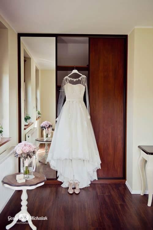 To tiulowa suknia z podpinanam trenem, w fasonie princessy, z delikatnie zaokrąglonym dekoltem, pięknie modeluje biust. Suknia wzbogacona jest o francuską koronkę Alencon, guziczki obszyte tkaniną. Robi wrażenie. Jest wygodna i piękna. Suknia wykorzystana podczas wesela i sesji ślubnej. Jest wyprana i wyprasowana w profesjonalnej pralni. Wygląda jak nowa.