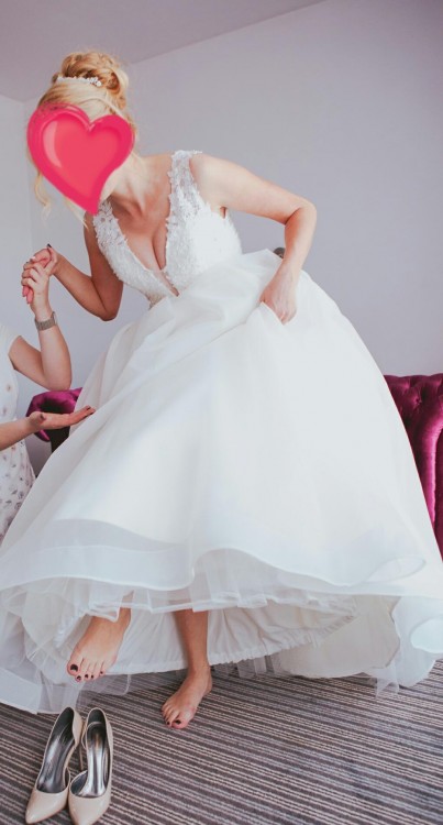 Suknia moze byc bez problemu skrócona. Kwestia przeszycia listwy dolnej.