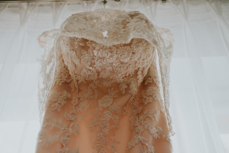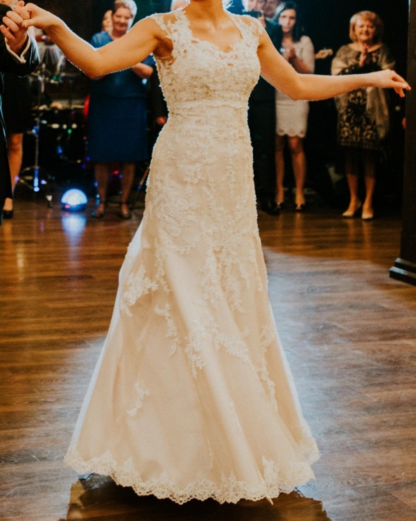 Suknia w całości pokryta jest delikatną koronką wysadzaną subtelnymi koralikami. Dodatkowo posiada satynowe podbicie w kolorze ecru co dodaje sukni elegancji i wytworności oraz świetnie pasuje do wszystkich kobiecych typów urody!