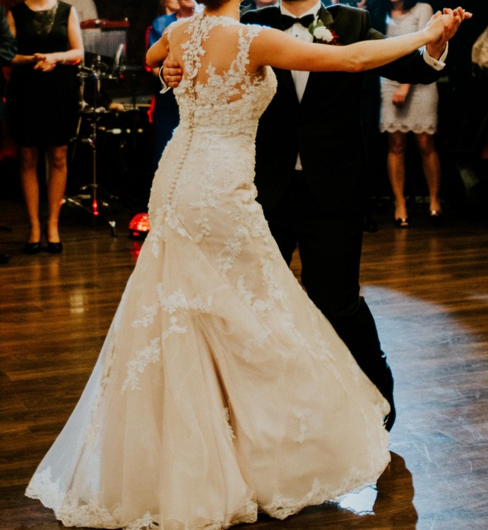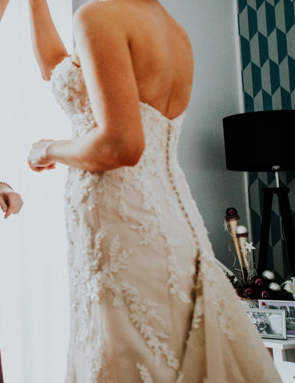 Dzięki bolerku zapinanemu na obciągnięte materiałem guziczki (identyczne jak w sukni) oraz możliwości podpięcia trenu uzyskujemy kilka stylizacji. Podczas ceremonii możemy zasłonić ramiona i plecy subtelną koronką oraz wyeksponować tren. Podczas wesela natomiast zdjąć bolerko (suknia z tyłu schodzi do połowy pleców), a tren upiąć na dwa niewidoczne guziczki. Tren jest wygodny i niesamowicie układa się w tańcu. Cała suknia jest lekka.
