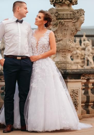 Suknia jest śnieżnobiała szyta na wzrost 167cm + obcas 7cm.
