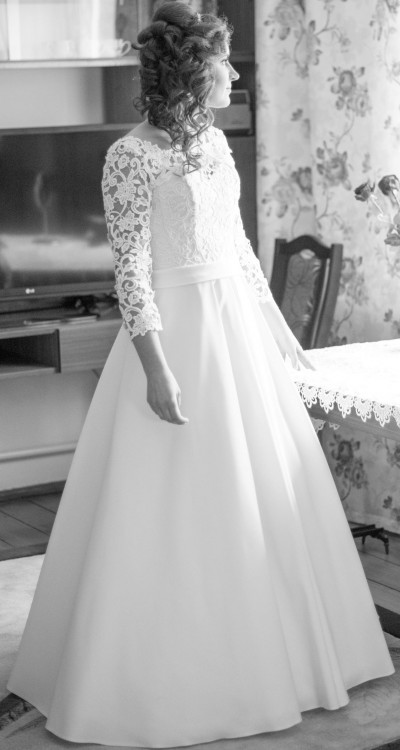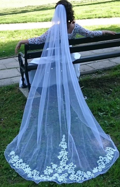 Dodatkowo suknia posiada długi welon z zakończeniem tej samej koronki co góra sukni oraz krótki welon obszyty satyną i halkę z kołem.