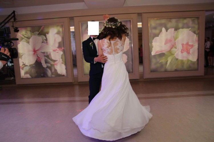 Mam do sprzedania sukienkę ślubną. Rozmiar 38. Stan sukienki bardzo dobry. Górna część z koronki, zapinana z tyłu na perełki. Dokna część z żorżety rozkloszowana dołem. Górna część oddzielona jest od dolnej części wąską tasiemką. Sukienka lekka, ładnie się układa i pięknie prezentuje sie podczas tańca. Co najważniejsze jest bardzo wygodna.