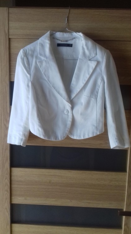 Jest możliwość dodatkowo dokupić biały żakiet, który idealnie pasuje do sukienki. Rozmiar 38, firma RESERVED, rękaw 3/4, zapinany na jeden guzik. Cena 30 zł.