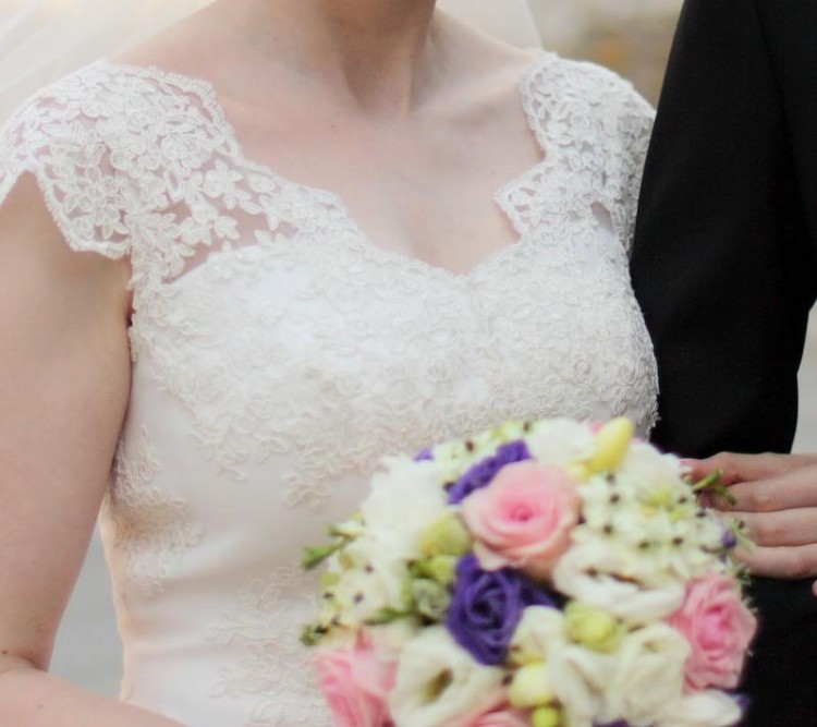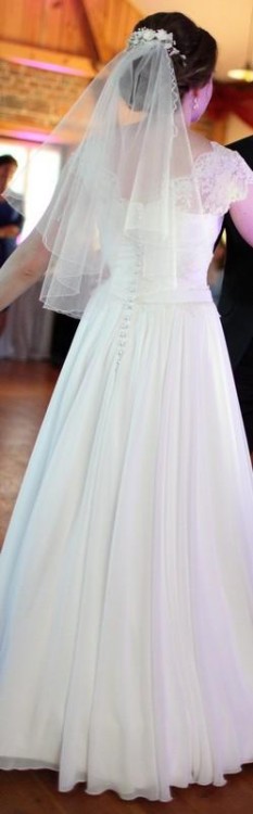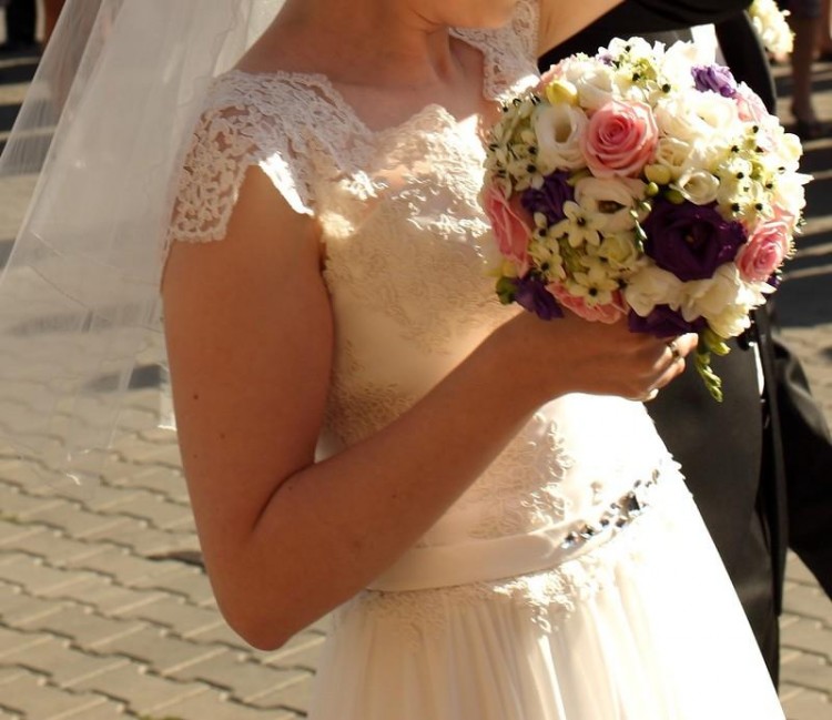 Sprzedam przepiękną suknię ślubną w kształcie litery A w kolorze Ivory w rozmiarze S/M. Góra sukni zdobiona śliczną francuską koronką, talia podkreślona paskiem z kryształkami Swarovskiego, dół szyfonowy. Suknia jest zwiewna, pięknie się układa podczas tańca. Można założyć pod nią koło (które sprzedaję razem z suknią) by miała nadaną formę, tak jak na zdjęciach lub można ją nosić bez koła - wtedy jest jeszcze bardziej dziewczęca. Suknia dla niskich dziewczyn (ja mam 160cm wzrostu + 3,5cm obcas).